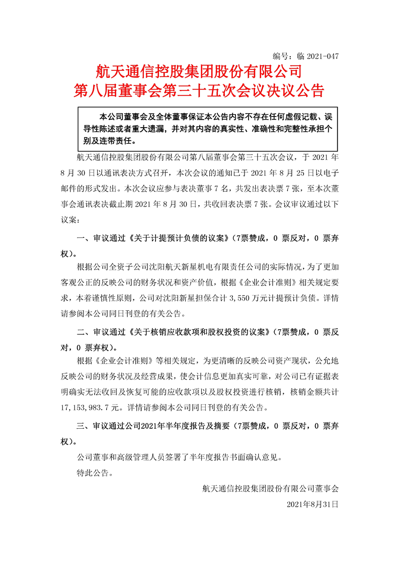 航天通信控股集團(tuán)股份有限公司八屆三十五次董事會決議公告