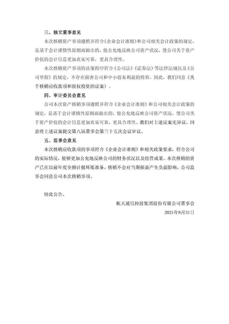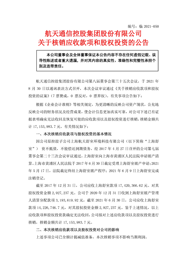航天通信控股集團(tuán)股份有限公司關(guān)于核銷應(yīng)收款項(xiàng)和股權(quán)投資的公告